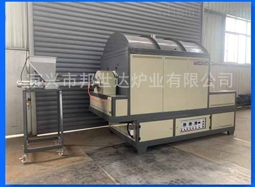 炉胆为大肚子形,大肚子型可以使物料固定在恒温区内旋转烧结,不会使物料跑到低温区内。炉胆内设置搅拌条,以翻动物料来增加物料与气氛的接触性。出料为自动出料,倾斜炉胆就可以倒料。