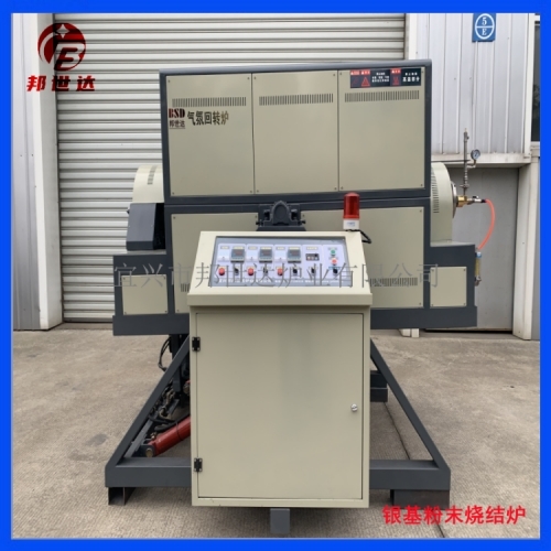 气氛回转炉,主要用于银基粉末或颗粒在气氛保护中的动态烧结旋转过程中,银基粉末或颗粒能翻转、抛落,使物料受热更均匀、减少结团、品质更高、进出料方便,且出料干净。