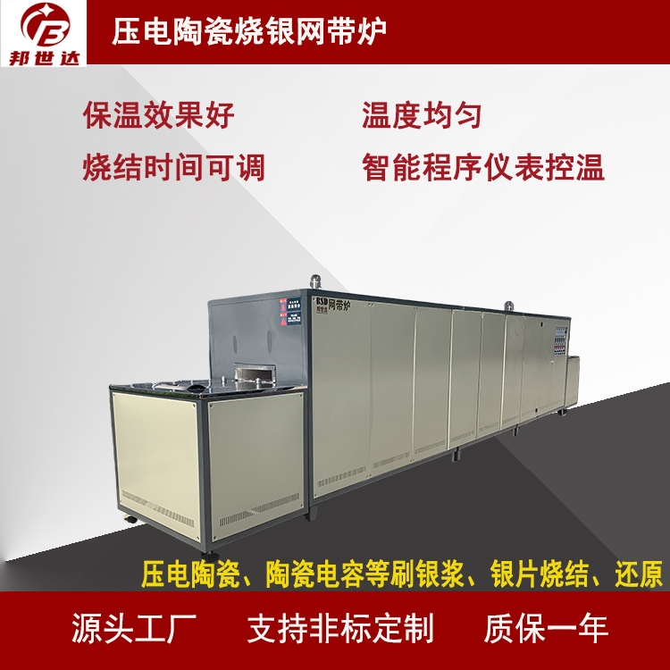压电陶瓷烧银网带炉 900℃网带式烧结炉主供压电陶瓷、陶瓷电容等刷银浆、银片烧结、还原,具有烧成周期短、产能高、能耗小、流水线操作方便、烧结成本低等优点。