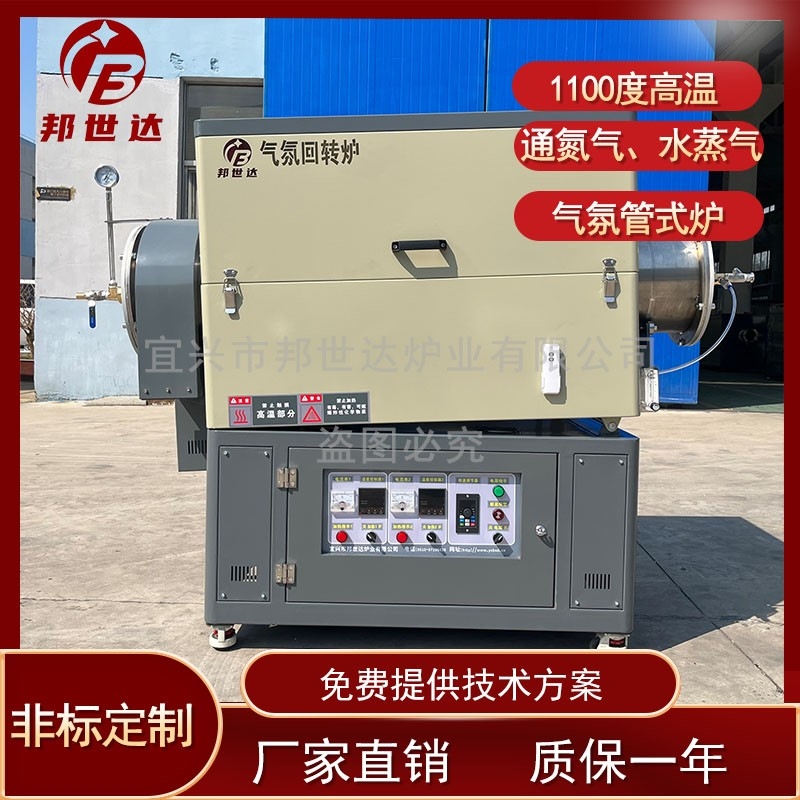 气氛回转炉,主要适用于粉料、颗粒的动态烧结使物料受热更均匀、烧结时间缩短、能 耗降低、品质高等优点。