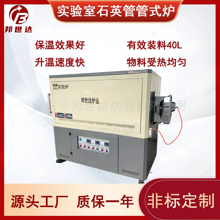 (3)炉胆采用石英管材质,炉膛为大肚子型,大肚子型可以使物料固定在恒温区内旋转烧结,不会使物料跑到低温区内。